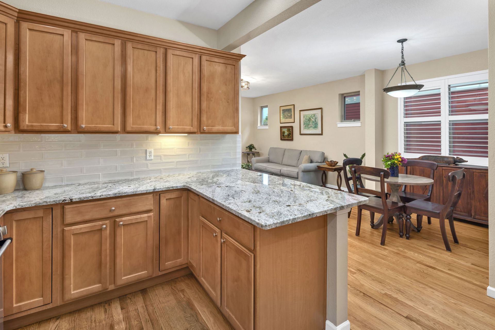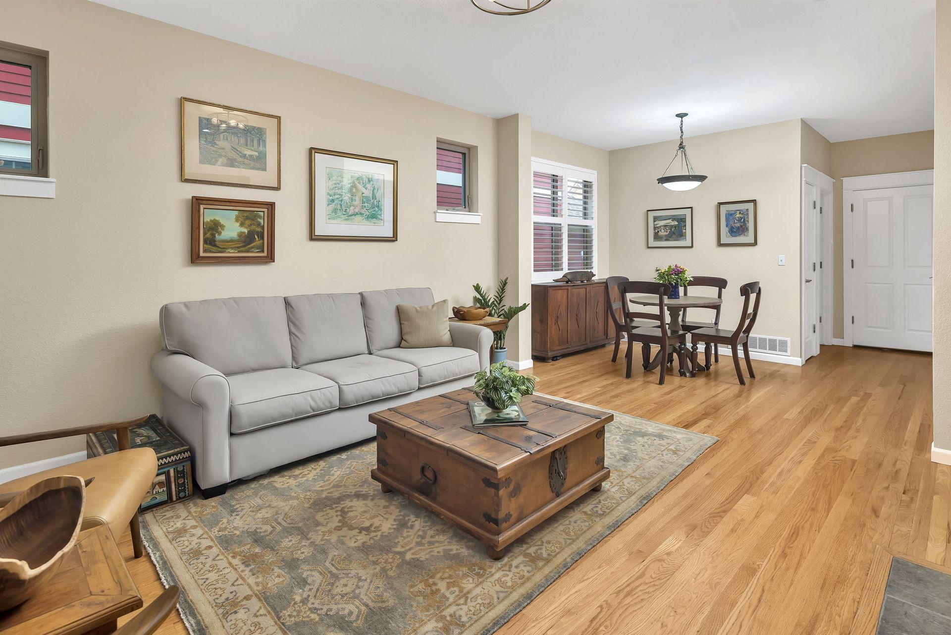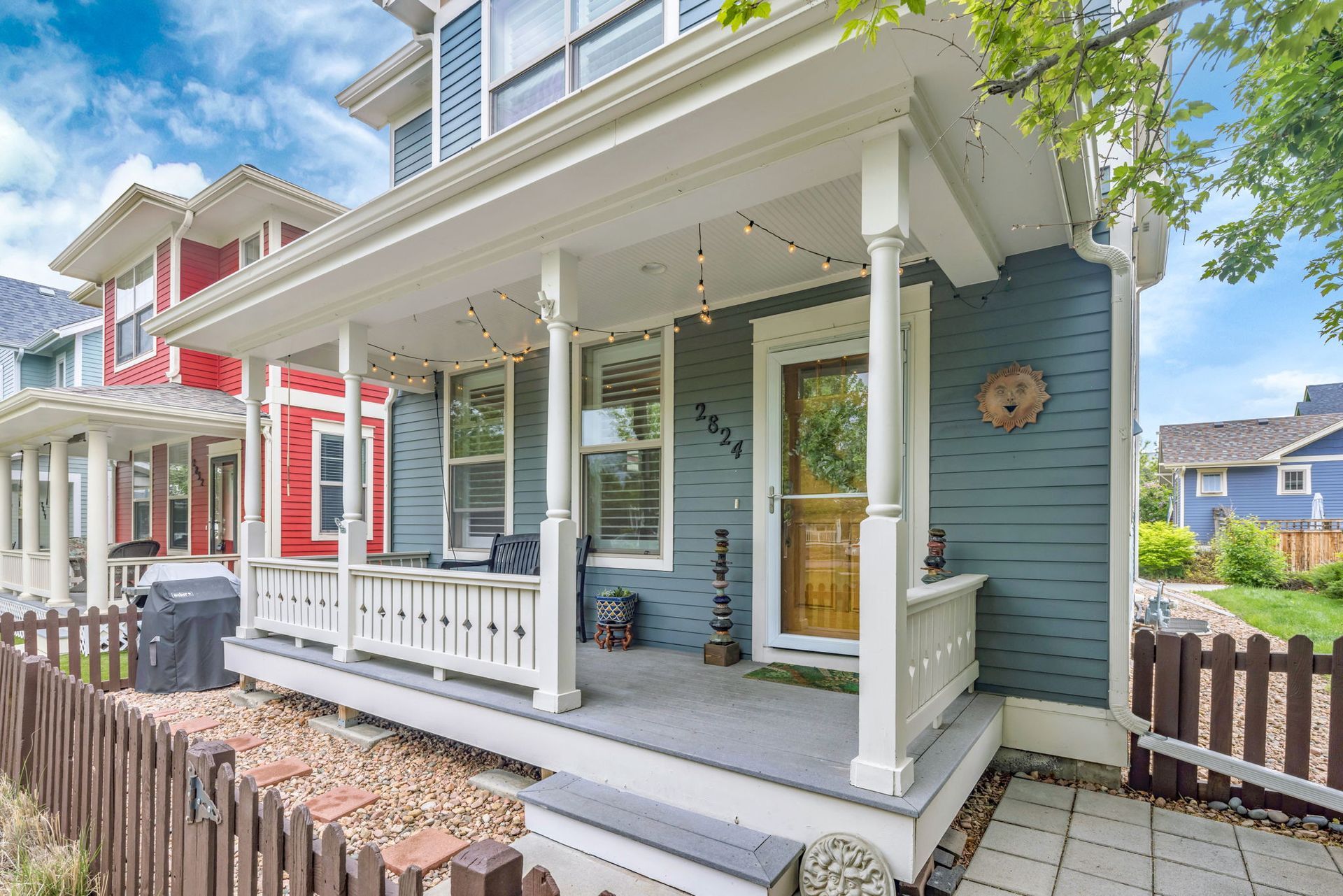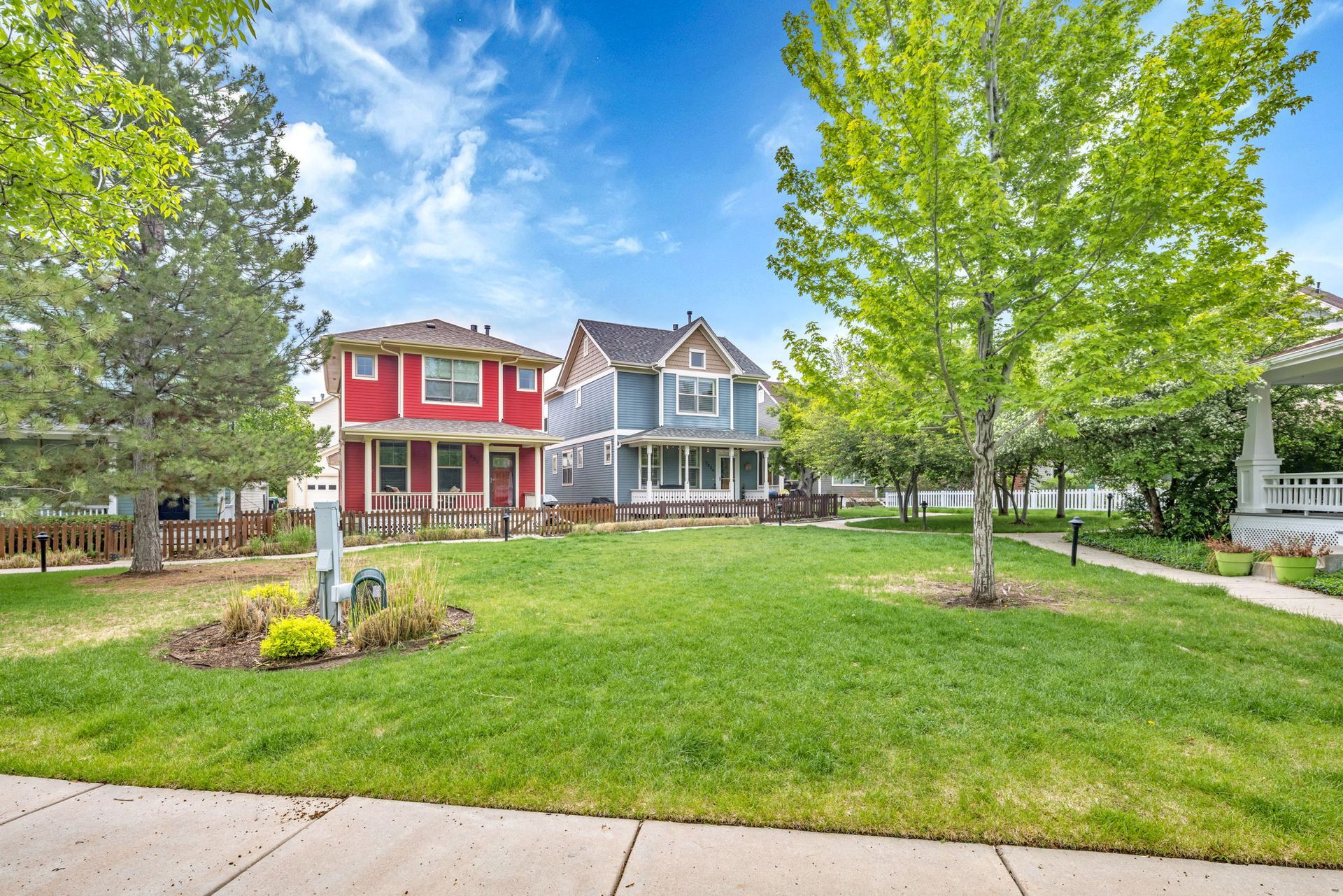 This lovely Eastbridge 2-story home is tucked back on a courtyard on a quiet street and features 4 beds/ 3.5 baths, oak floors, 2-car attached garage and a finished basement. Come inside, past the covered front porch into the spacious open-concept main living area. The living room showcases courtyard views and a timeless white mantle gas fireplace. The living space flows naturally into the dining room and beautifully renovated kitchen, perfectly finished with new granite counters and stainless steel appliances. A powder bath completes the main level. Head upstairs to the primary suite with majestic vaulted ceilings, a large walk-in closet and adjacent 5-piece bath, including a soaking tub, double sink vanity and a glass enclosed shower. Two additional bedrooms and a full bath with a tub shower are also found on this level. The basement is host to an additional bedroom and connected full bath, a finished storage closet with shelving, and a flex space, perfect for a workout room or a dedicated office. Quick commute to Anschutz Medical Complex, Downtown Denver and DIA! Close to shopping and restaurants at Stanley Marketplace and Eastbridge Town Center!