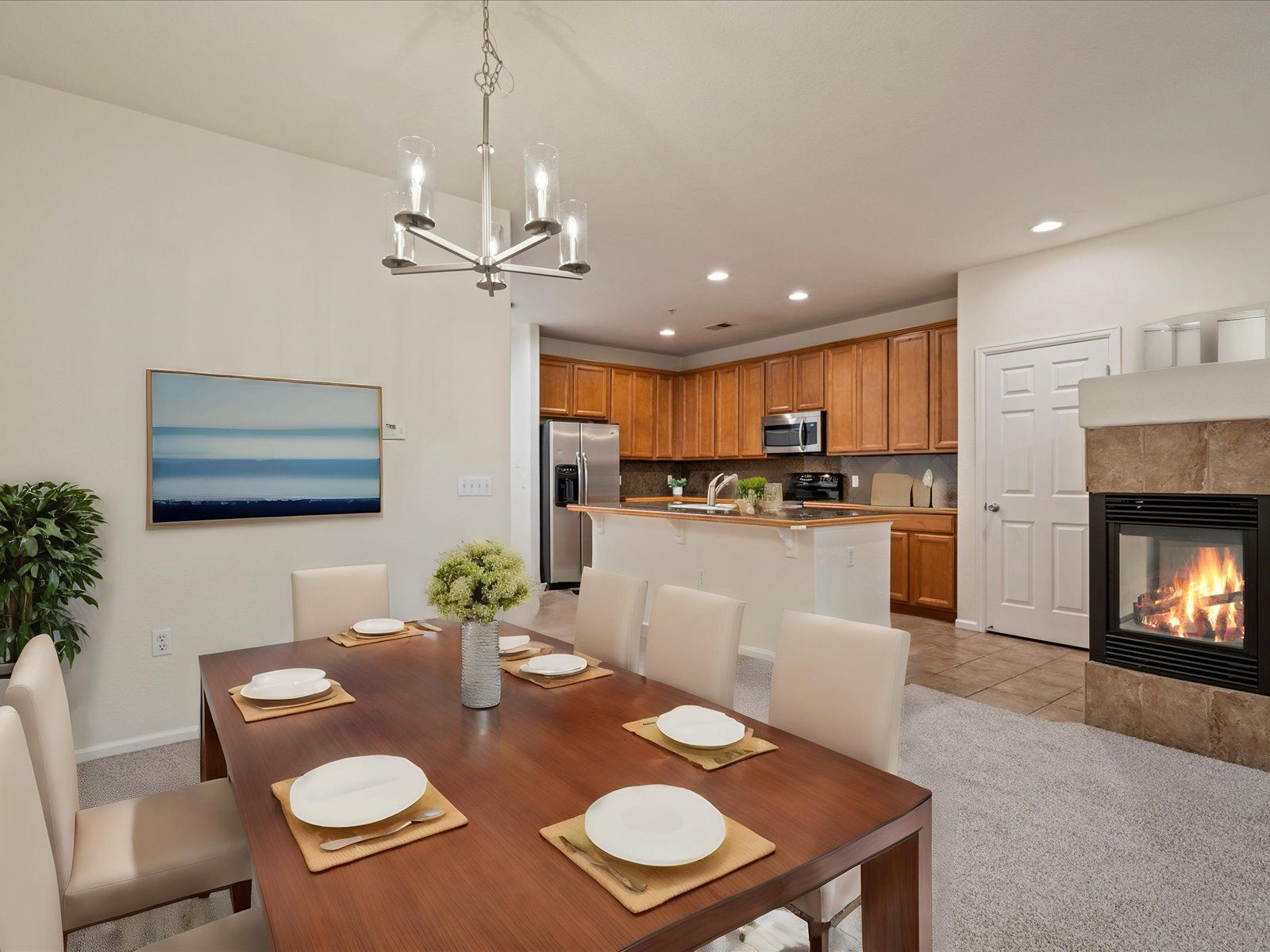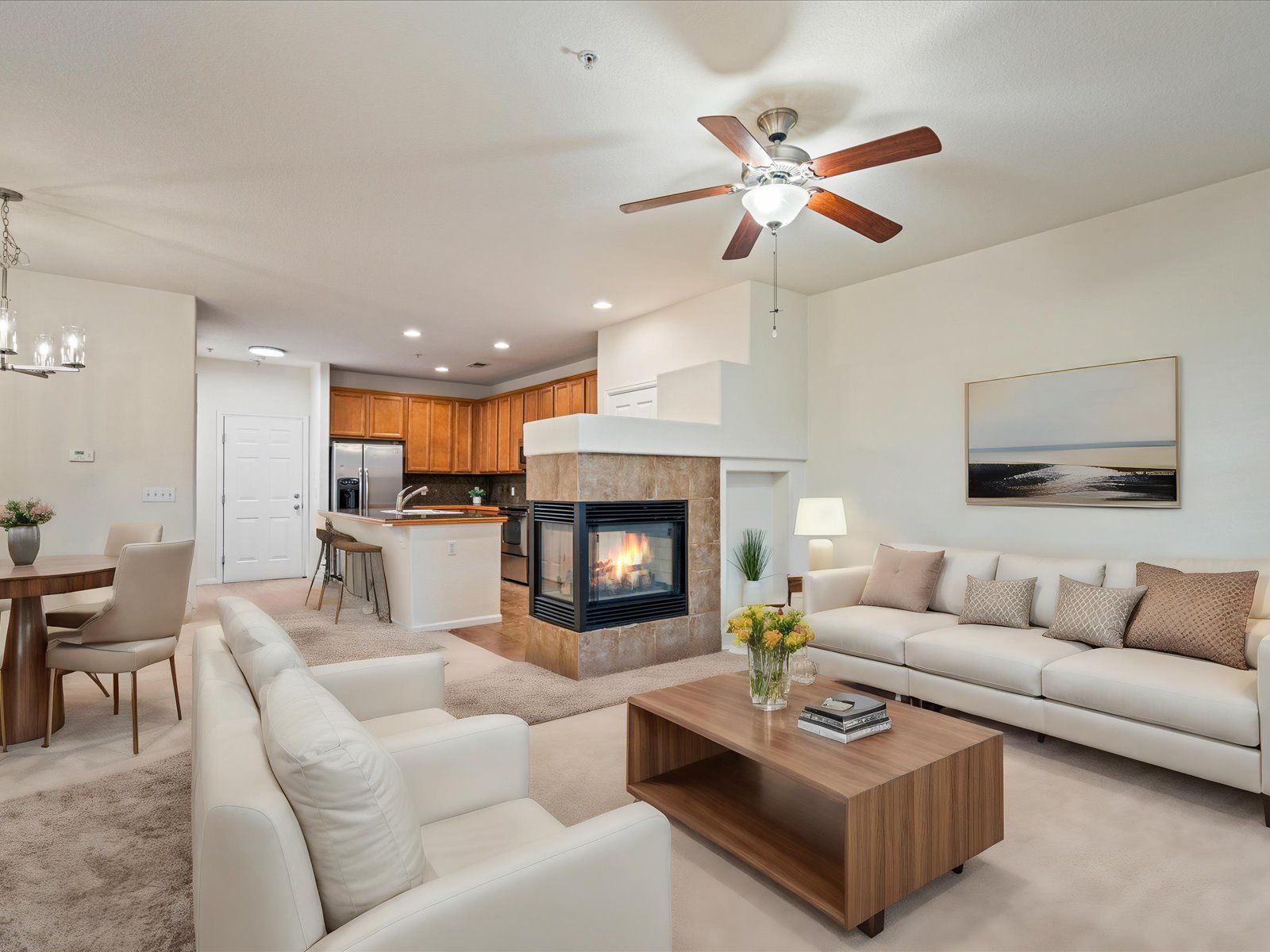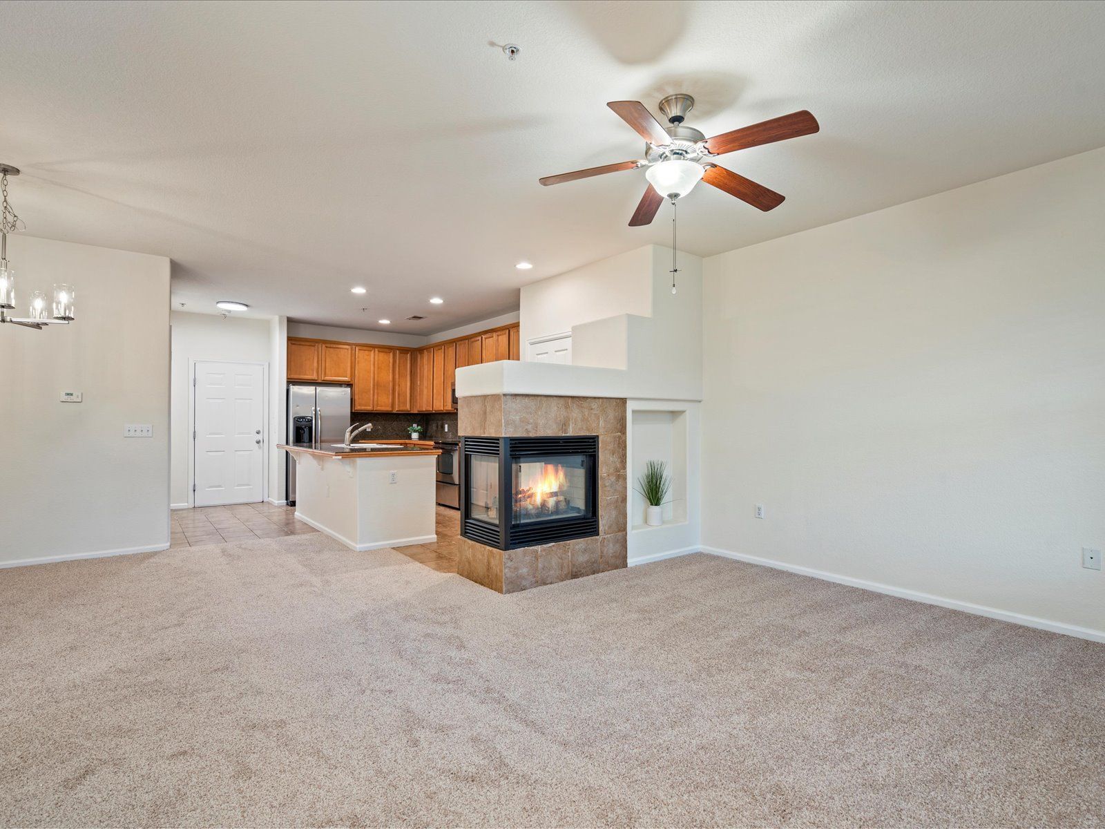 Fantastic 2 bedroom, 1 bath corner unit condo with a laundry room, 2-car attached garage and no-stairs layout in Eastbridge north! Directly across from the Central Park Recreation Center and just blocks away from a plethora of dining and shopping options at Eastbridge Town Center and Stanley Marketplace, this ultra-central condo offers a premier location in Central Park! Come inside past the covered front porch, the perfect place to enjoy your morning coffee, and discover the open main living area with fresh paint and updated lighting. The spacious living room invites for cozy evenings with a 3-sided gas fireplace, while the nearby dining room allows for easy entertaining. The kitchen comes fully equipped with an 8-foot island, granite counters and stainless steel appliances. A large primary bedroom complete with a 7-foot walk-in closet, private sink vanity and en-suite access to the full bath with a garden tub & shower. A spacious secondary bedroom and a laundry room with included full size washer and dryer, round out this ultra-conveniently located home. Quick commute to Anschutz Medical Campus, Downtown Denver and DIA! Only blocks from the F-15 Pool and miles of trails in Bluff Lake. Living in the heart of Central Park has never been so easy! Tenant responsible for flat rate utility fee which includes water, trash/recycle and sewer.