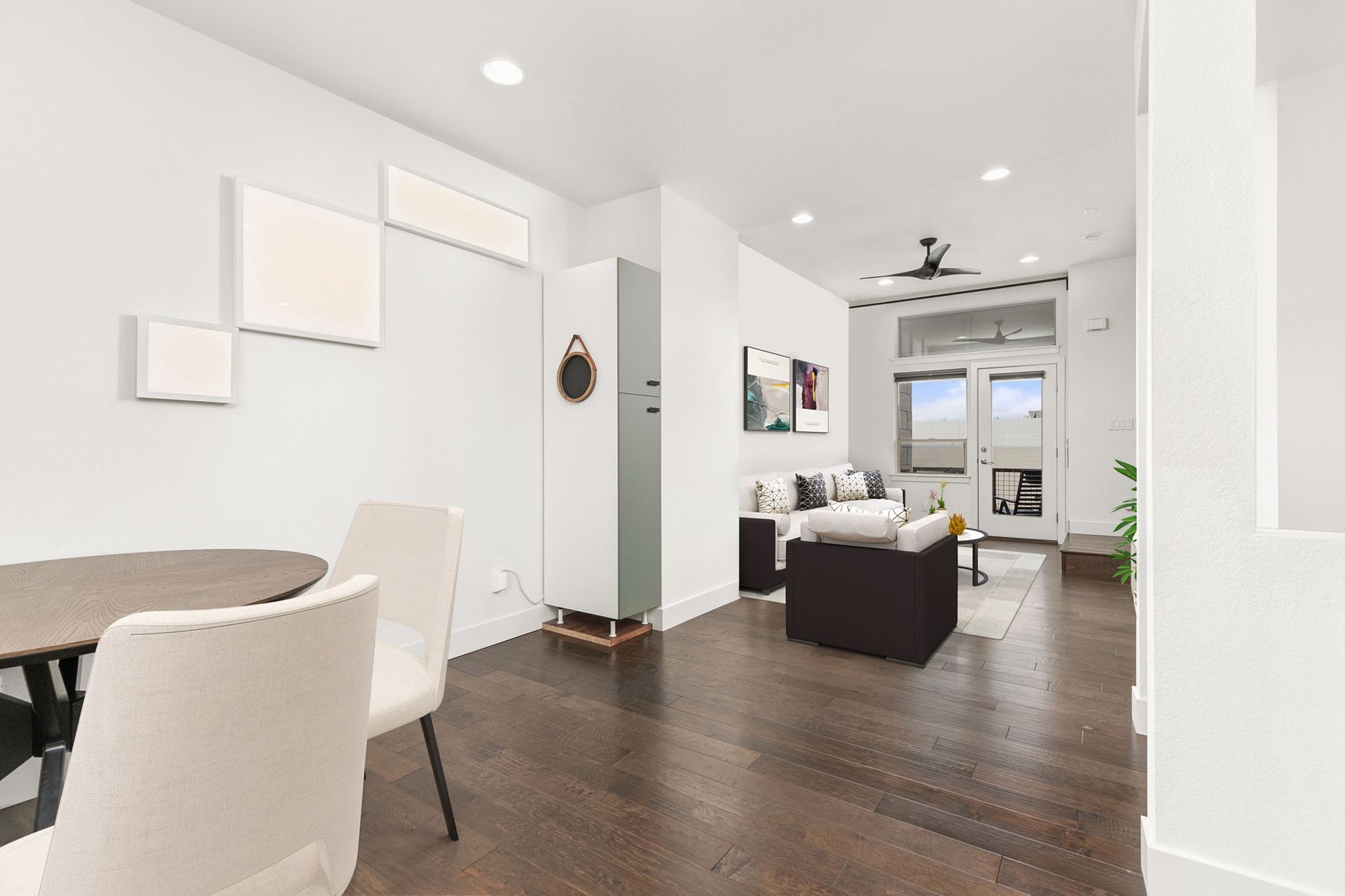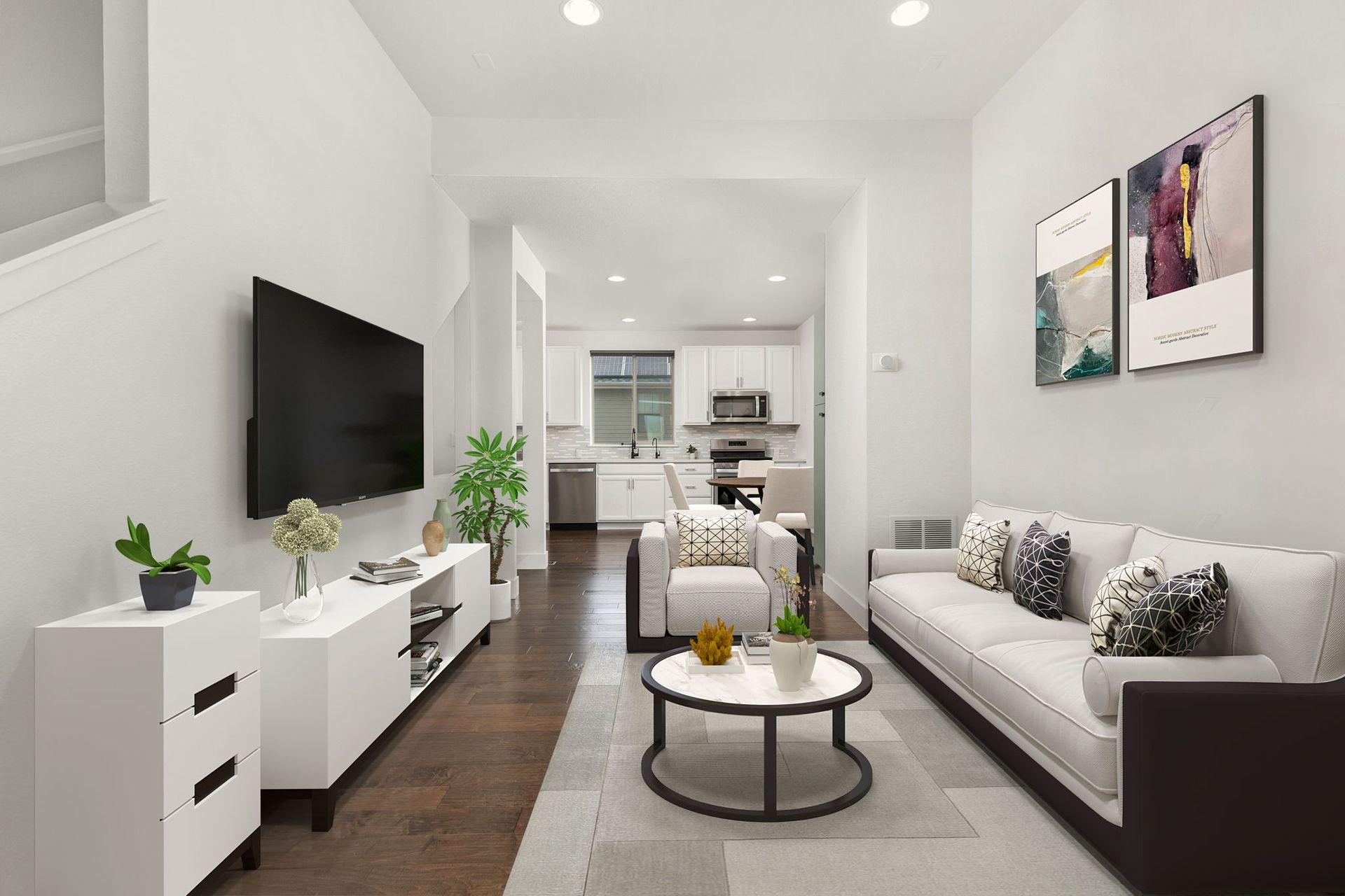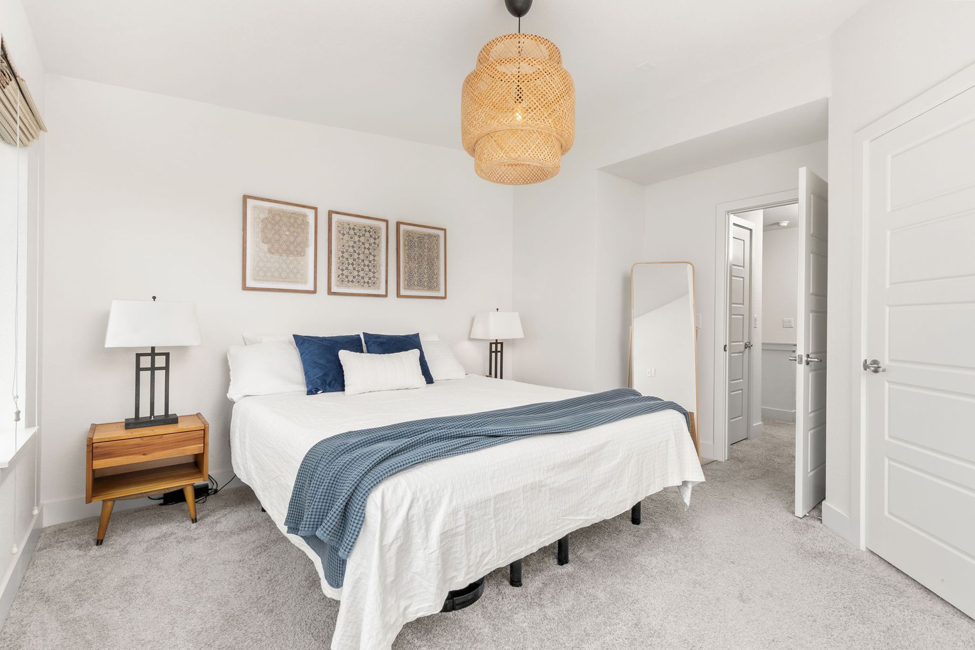 Spectacular views from this fantastic West-facing 2 bedroom, 1.5 bath modern townhome, located near the best Central Park's North End neighborhood has to offer! This beautifully maintained home with an walkable location is just a block away from Highland Park/Pump Track, nearby Splash Landing Pool, the North Sports Fields, and Inspire Elementary. This freshly painted home boasts gorgeous finishes throughout and breathtaking mountains views from the main level balcony! The fenced-in front yard welcomes you past the front porch and upstairs to the open-concept main level featuring 10 ft high ceilings and warm wood floors. The kitchen features quartz counters, 5-burner gas stove, stainless steel appliances, marbled tile backsplash and modern white shaker soft-close cabinetry. Adjacent to the kitchen, the dining area flows into the spacious living room provides access to the private west-facing balcony where you can enjoy winding down for the day watching the sun set over the Rocky Mountains. A conveniently-located half bath is also located on this level. Head upstairs to find the primary bedroom with a large walk-in closet and magnificent views that will make waking up in the morning a true delight! ! A beautiful full bath with quartz counters, tub/shower combo and white shaker cabinets separates the primary and an additional bedroom to complete the level. The lower level includes a covered front porch patio and yard, an inviting foyer, a laundry room and a finished garage with epoxy flooring complete this gorgeous home. Quick commute to Anschutz Medical Complex, Downtown and DIA! 2 pets allowed with pet screening and pet rent. Tenant responsible for flat rate utility fee which includes water, trash/recycle and sewer. License #2024-BFN-0038931.