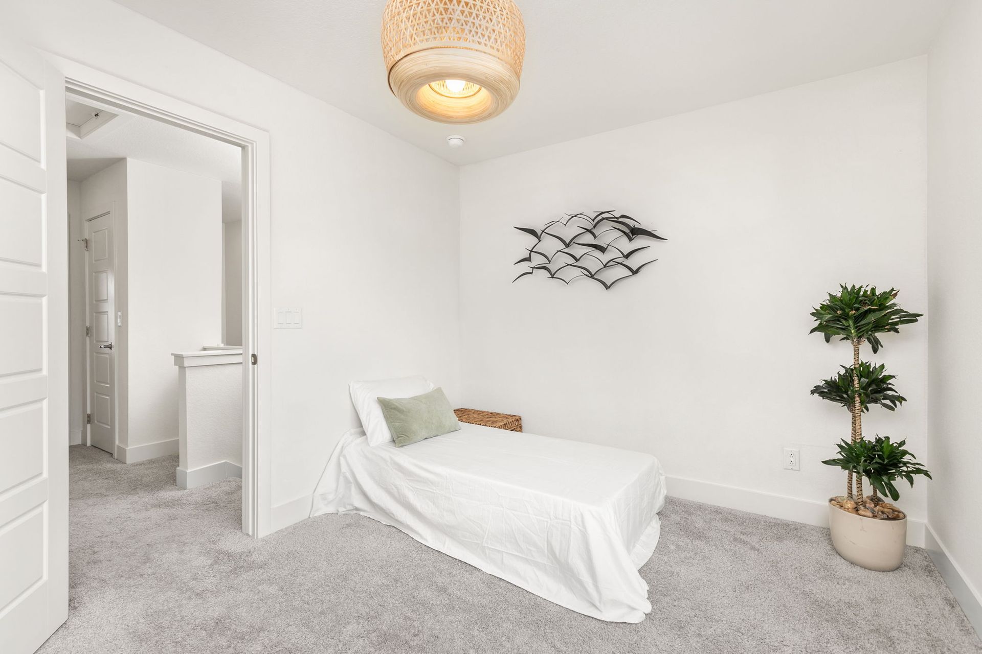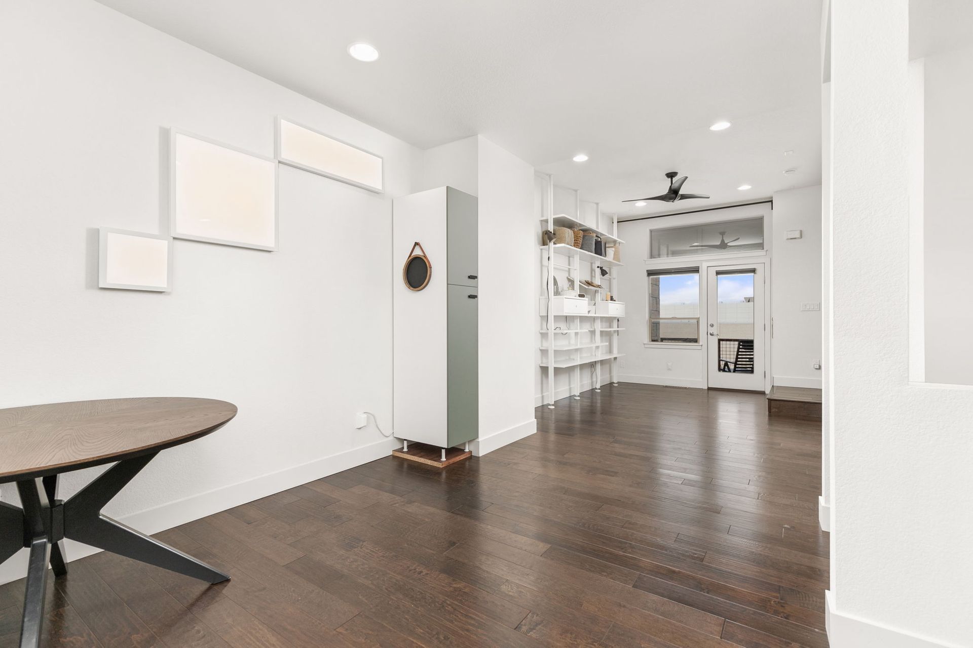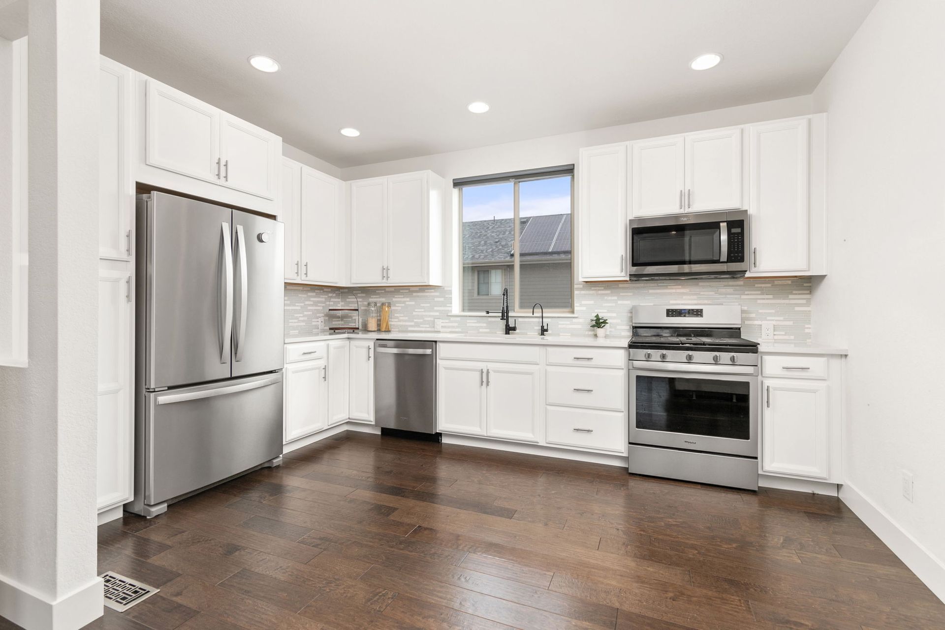 Spectacular views from this fantastic West-facing 2 bedroom, 1.5 bath modern townhome, located near the best Central Park's North End neighborhood has to offer! This beautifully maintained home with an walkable location is just a block away from Highland Park/Pump Track, nearby Splash Landing Pool, the North Sports Fields, and Inspire Elementary. This freshly painted home boasts gorgeous finishes throughout and breathtaking mountains views from the main level balcony! The fenced-in front yard welcomes you past the front porch and upstairs to the open-concept main level featuring 10 ft high ceilings and warm wood floors. The kitchen features quartz counters, 5-burner gas stove, stainless steel appliances, marbled tile backsplash and modern white shaker soft-close cabinetry. Adjacent to the kitchen, the dining area flows into the spacious living room provides access to the private west-facing balcony where you can enjoy winding down for the day watching the sun set over the Rocky Mountains. A conveniently-located half bath is also located on this level. Head upstairs to find the primary bedroom with a large walk-in closet and magnificent views that will make waking up in the morning a true delight! ! A beautiful full bath with quartz counters, tub/shower combo and white shaker cabinets separates the primary and an additional bedroom to complete the level. The lower level includes a covered front porch patio and yard, an inviting foyer, a laundry room and a finished garage with epoxy flooring complete this gorgeous home. Quick commute to Anschutz Medical Complex, Downtown and DIA! 2 pets allowed with pet screening and pet rent. Tenant responsible for flat rate utility fee which includes water, trash/recycle and sewer. License #2024-BFN-0038931.