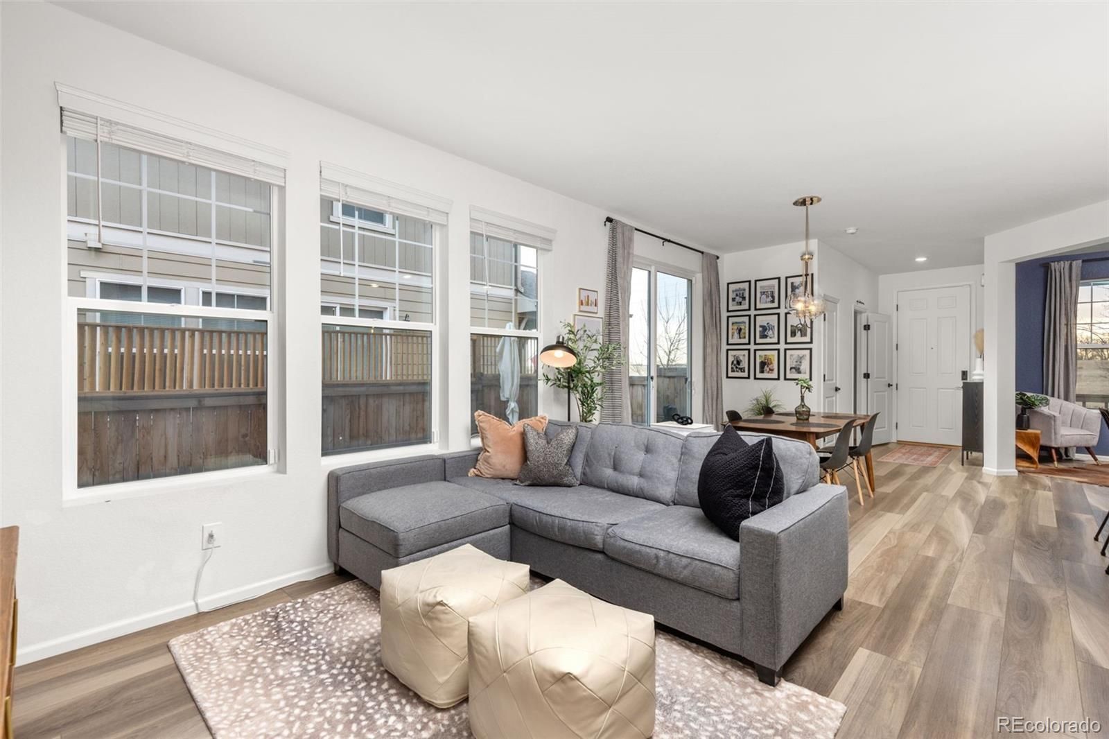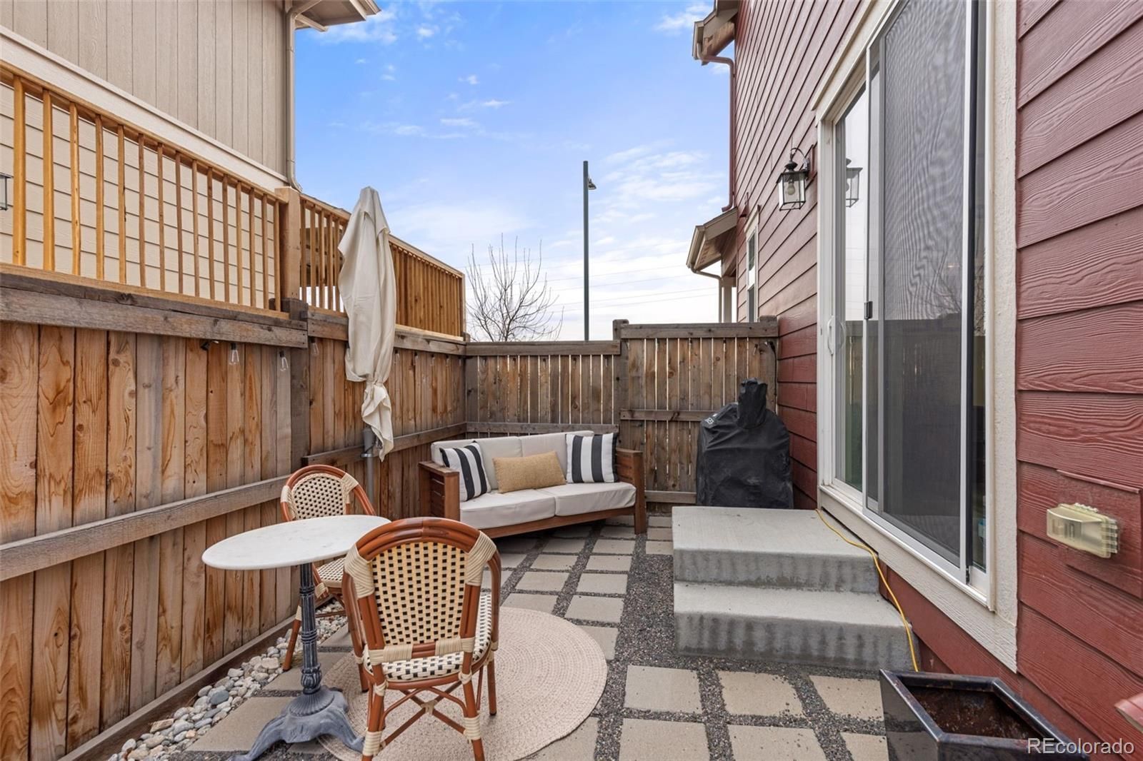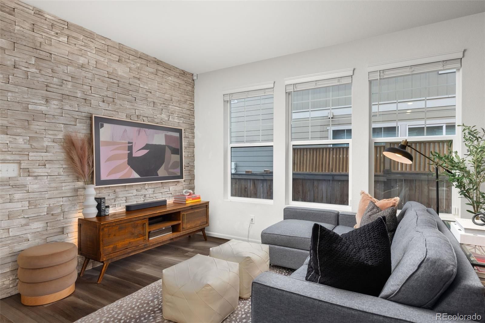 Gorgeous 3 bedroom, 2.5 bath paired home with a main floor office, private yard and attached 2- car garage in Central Park's North End neighborhood! With easy access to miles of hiking and biking trails and the green open spaces of Rocky Mountain Arsenal, this home's lovely finishes compliments the beauty of its exterior surroundings. The main floor features a large office, an open concept main level with a living room with a stunning stone accent wall, a state-of-the art kitchen, and a central dining space with access to the yard via sliding glass door. The spacious and open kitchen is perfect for entertaining and includes quartz counters, SS appliances, a 5 burner gas range, a pantry, white shaker cabinets and a central island. The low-maintenance turf backyard and paver stone patio is ready for you to enjoy the Colorado sunshine! A convenient powder room and a large under-stairs storage rounds out the main level. Upstairs, the spacious primary bedroom has a large walk-in closet and a bathroom ensuite with a dual sink quartz vanity and framed walk-in glass enclosed shower. Two additional bedrooms, a laundry room, as well as a full bath with tub/shower combo complete the second floor. Smart thermostat included! Walking distance to parks, High Plains bike pump track, pickle ball courts, and Splash Landing Pool. Quick commute to Anschutz Medical Complex, Downtown and DIA! 1 dog allowed with pet screening and pet rent. Tenant responsible for flat rate utility fee which includes water, trash/recycle and sewer.