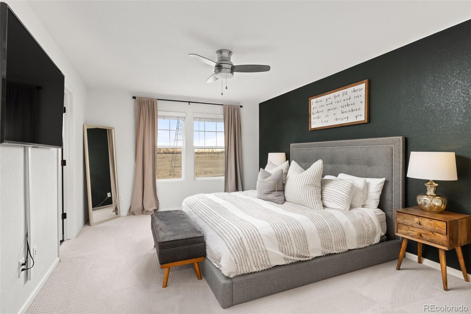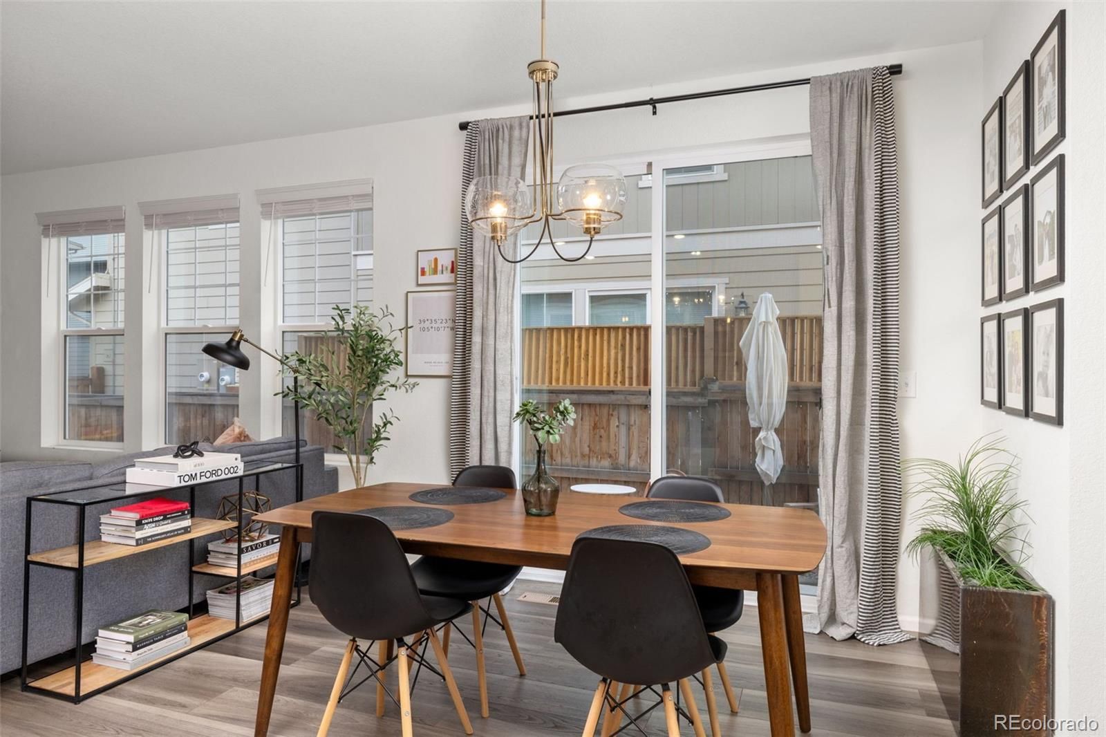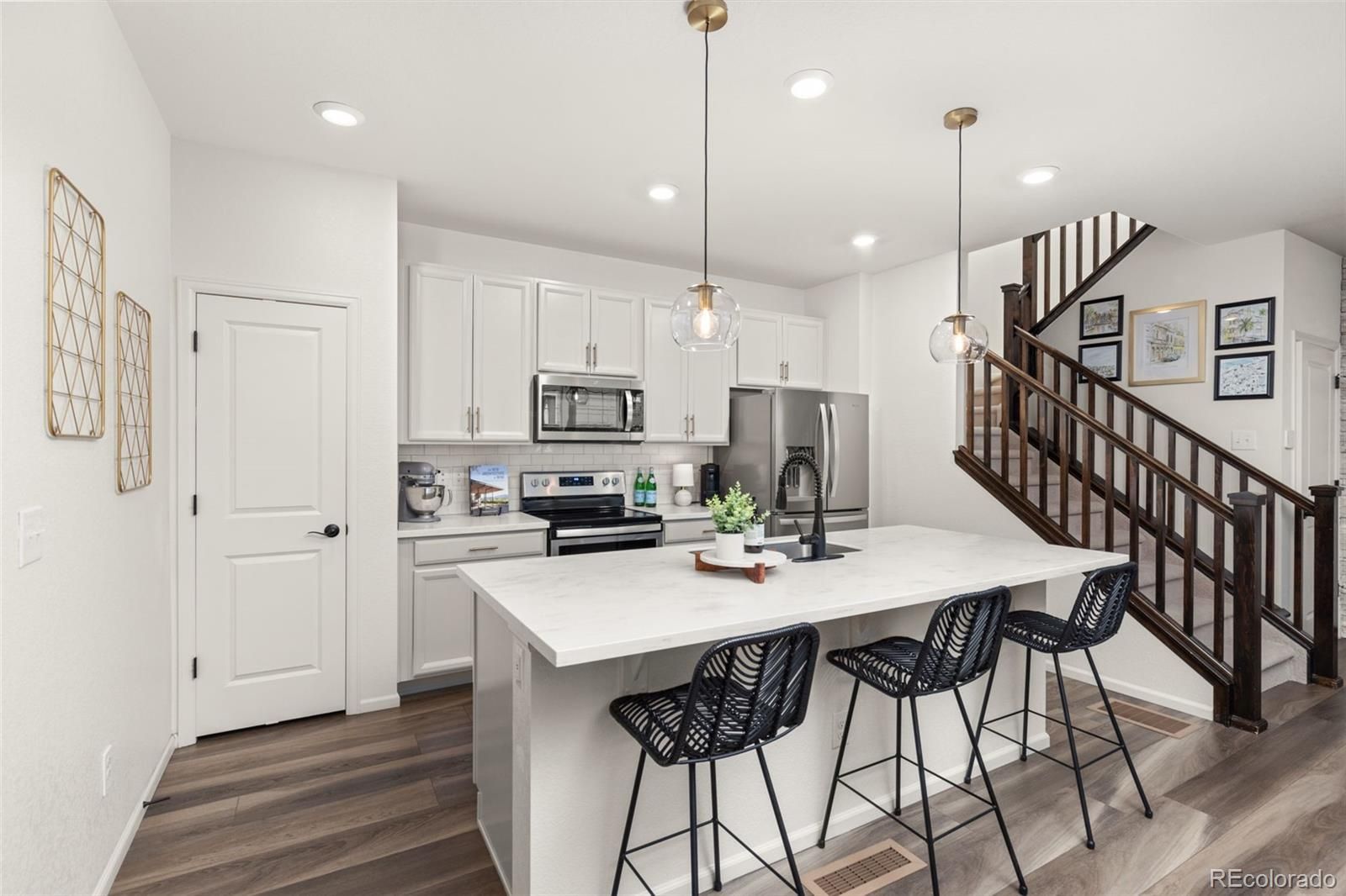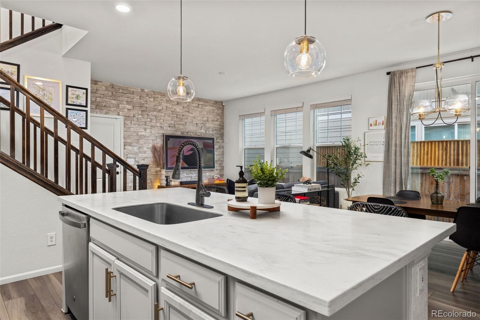 Gorgeous 3 bedroom, 2.5 bath paired home with a main floor office, private yard and attached 2- car garage in Central Park's North End neighborhood! With easy access to miles of hiking and biking trails and the green open spaces of Rocky Mountain Arsenal, this home's lovely finishes compliments the beauty of its exterior surroundings. The main floor features a large office, an open concept main level with a living room with a stunning stone accent wall, a state-of-the art kitchen, and a central dining space with access to the yard via sliding glass door. The spacious and open kitchen is perfect for entertaining and includes quartz counters, SS appliances, a 5 burner gas range, a pantry, white shaker cabinets and a central island. The low-maintenance turf backyard and paver stone patio is ready for you to enjoy the Colorado sunshine! A convenient powder room and a large under-stairs storage rounds out the main level. Upstairs, the spacious primary bedroom has a large walk-in closet and a bathroom ensuite with a dual sink quartz vanity and framed walk-in glass enclosed shower. Two additional bedrooms, a laundry room, as well as a full bath with tub/shower combo complete the second floor. Smart thermostat included! Walking distance to parks, High Plains bike pump track, pickle ball courts, and Splash Landing Pool. Quick commute to Anschutz Medical Complex, Downtown and DIA! 1 dog allowed with pet screening and pet rent. Tenant responsible for flat rate utility fee which includes water, trash/recycle and sewer.